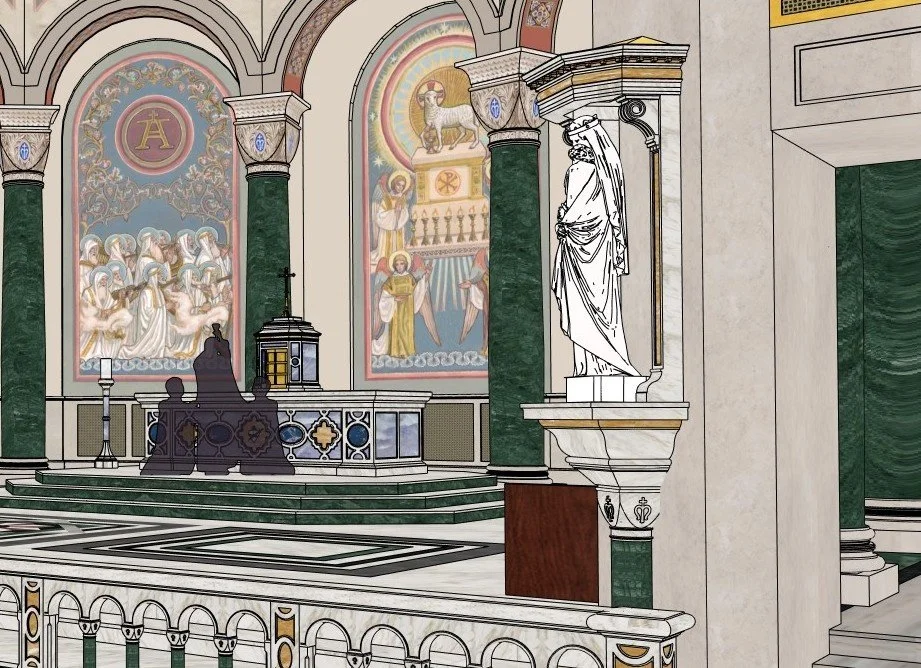 A Pedestal & Canopy has been designed for a statue of Our Lady of Perpetual Help. The original architect and stone mason have created a design on the epistle side of the sanctuary that balances the gospel side’s ambo (marble pulpit). Identical marble and granite are being ordered from the same source in Turkey as all other stonework in and around the high altar of the Immaculata.